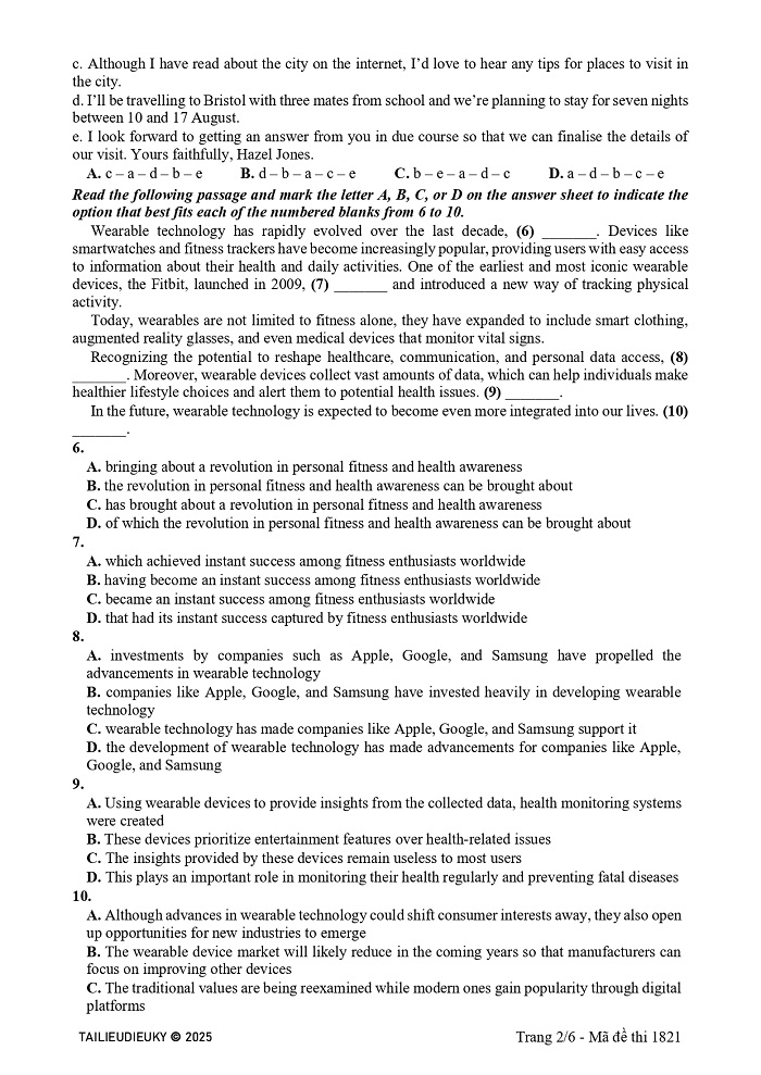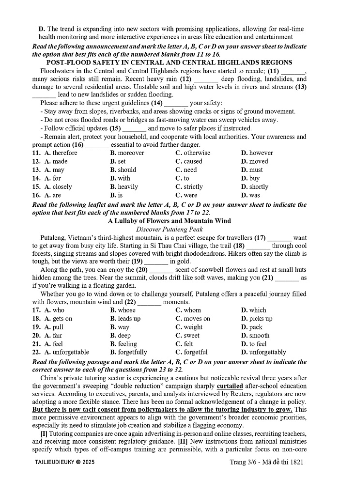 - Đọc và điền từ/cụm từ ngắn để hoàn thành đoạn văn/văn bản (12 câu) - Đọc và điền từ/cụm từ dài để hoàn thành đoạn văn/văn bản (5 câu) - Sắp xếp câu thành đoạn hội thoại/lá thư/đoạn văn (5 câu) - Đọc hiểu (một bài 8 câu và một bài 10 câu) |