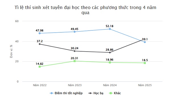 Thống kê từ Bộ GD&ĐT cho thấy năm 2025 có 17 phương thức xét tuyển. Trong đó, tỉ lệ thí sinh sử dụng phương thức xét học bạ chiếm 42,4%, xét bằng điểm thi tốt nghiệp THPT chiếm 39,1%, các phương thức khác chiếm 18,5%. Như vậy, năm nay, tỉ lệ thí sinh xét tuyển đại học bằng học bạ chiếm tỉ lệ cao nhất trong 17 phương thức. Điều này chưa từng có trước đây.