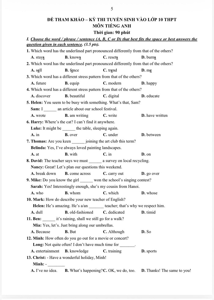 Đề tham khảo môn Tiếng Anh thi vào lớp 10 TP.HCM theo chương trình mới