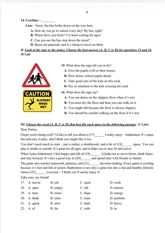 - Phần 2 (3,0 điểm) từ câu 5 đến câu 16, kiểm tra từ vựng, ngữ pháp, giao tiếp