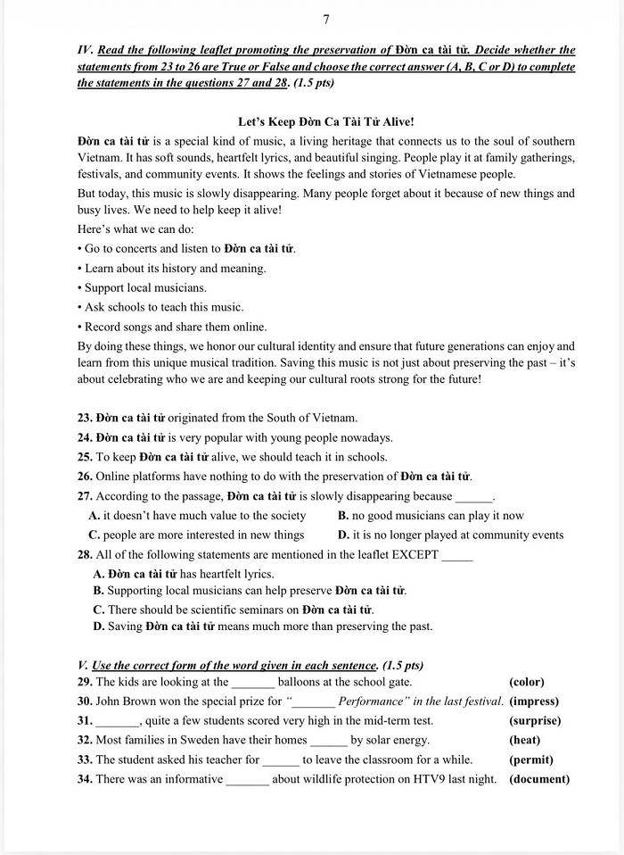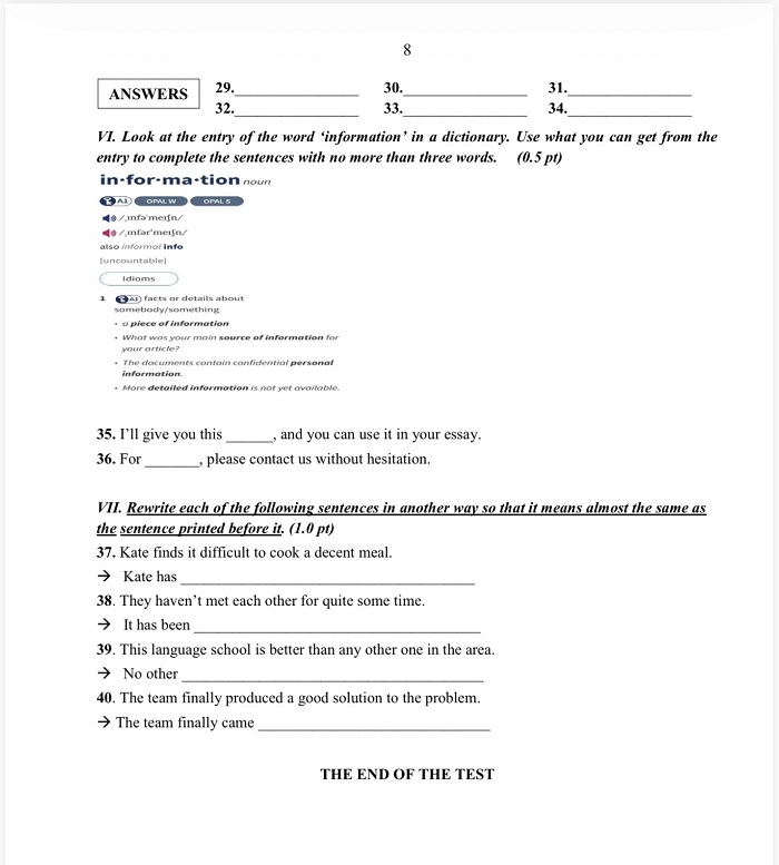 - Phần 4 (4,0 điểm) từ câu 29 đến 40 gồm viết dạng đúng của từ; viết cụm từ phù hợp theo thông tin cho sẵn; viết câu.