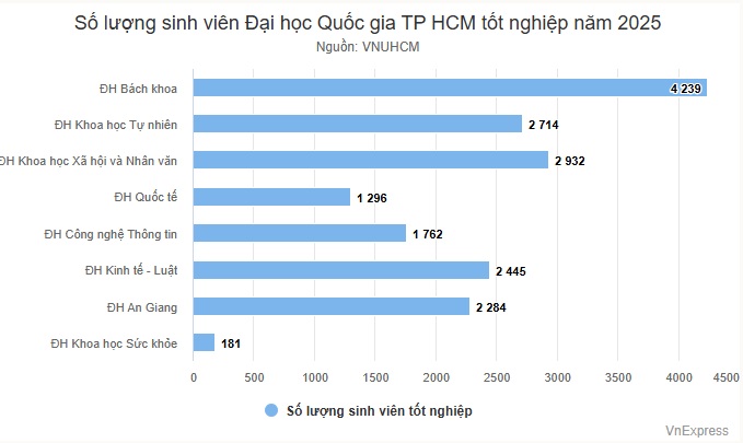 Số liệu được Trung tâm Khảo thí và Đánh giá chất lượng đào tạo, Đại học Quốc gia TP.HCM công bố gần đây. Trong hơn 17.800 sinh viên tốt nghiệp năm nay, tỷ lệ hoàn thành chương trình đúng thời hạn có sự phân hóa mạnh giữa các trường thành viên.